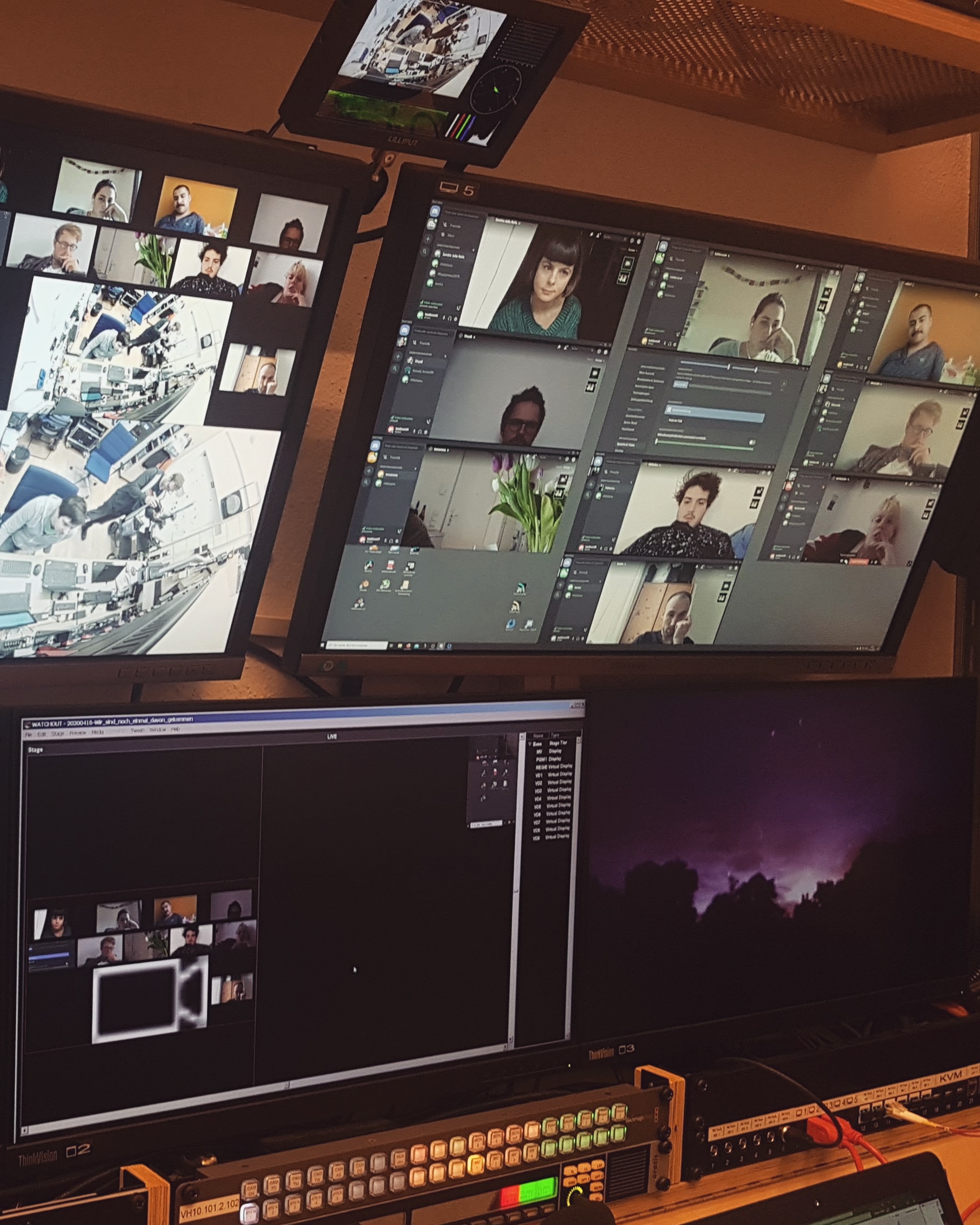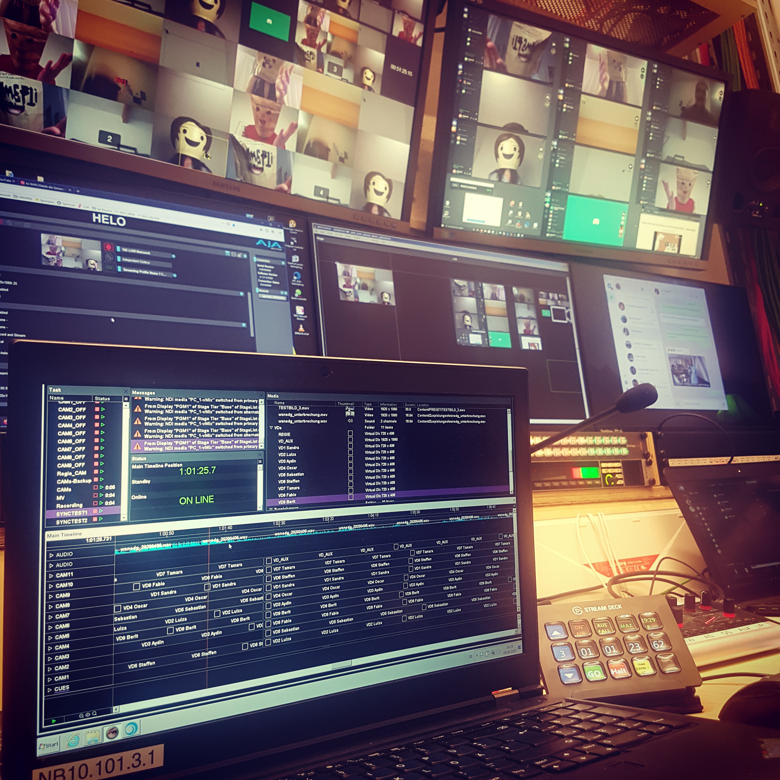 Wir haben die einzelnen Streams der Darsteller aus ihrem Zuhause empfangen und mittels Medienserver (Dataton Watchout) neu zu einem Sendesignal zusammengesetzt, welches dann live auf Youtube als Live-Stream gesehen werden konnte. Die besondere Herausforderung dabei war der Umgang mit den verschiedenen Latenzen der einzelnen Streams, welche mittels Audio-Delay im Rückkanal (N-1) zu den Darstellern kompensiert wurden.